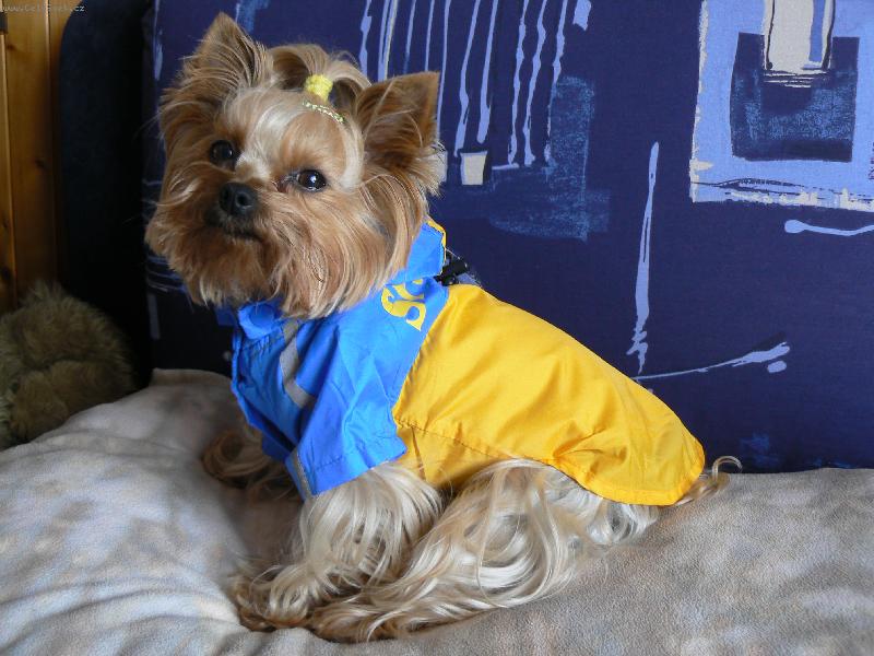 tohle je kupovaná pláštěnka (nejlevnejí na allpetu) a skvěle sedí!!jako jeden z mála prodávaných oblečků